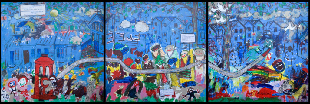 Barbara Kendall Reed, better known as the painter and designer B. Kendall, has captured this electric moment in a triptych painting, totaling twelve feet, and titled “And The Children Marched”. The acrylic on wood composition is a tribute to the often unacknowledged contribution children have made to civil rights, and is a monument to the courage and resolve young people can bring to struggles against injustice.